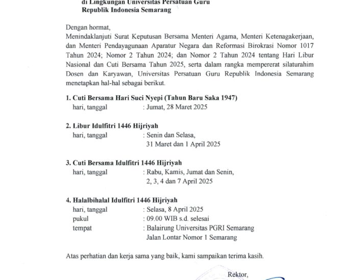 Cuti Bersama, Libur Nasional & Halalbihalal Universitas PGRI Semarang Tahun 2025 2025-03-10 By: admin On: March 10, 2025 In: ALUMNI FAKULTAS HUKUM, BERITA, KEMAHASISWAAN