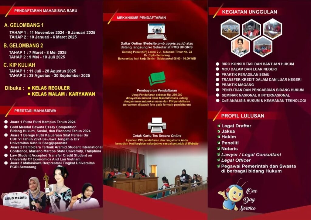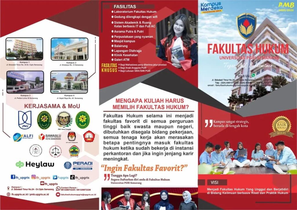 Fakultas Hukum Universitas PGRI Semarang membuka Penerimaan Mahasiswa Baru (PMB) untuk Tahun Akademik 2025/2026. Sebagai salah satu fakultas dengan komitmen kuat terhadap pembentukan lulusan berkarakter, berintegritas, dan berkompetensi tinggi, Fakultas Hukum UPGRIS menawarkan lingkungan akademik yang inovatif, dinamis, serta didukung oleh tenaga pengajar profesional di bidangnya.